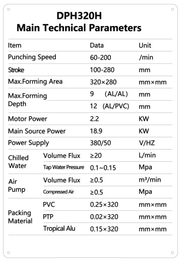 Cette machine d'emballage de type blister de type à rouleaux à grande vitesse DPH320H est associée à un mécanisme formant, d'alimentation automatique spéciale, d'étanchéité, de perforation, de découpe de gaufrage et de blister. Adapté Alu / PVC, PVDC, PET & ALU / Alu Blister Emballage pour tablettes, capsules, gels doux, etc.