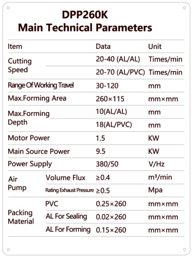 Machine d'emballage de blister à plat plat 1.DPP260K pourrait être séparée pour entrer dans l'ascenseur et l'atelier propre, adopter l'emplacement de la goupille de la colonne, la fixation des boulons, la production facile à la série.